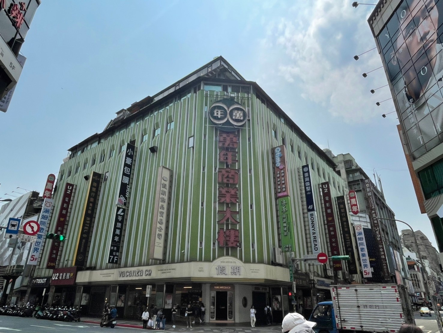 位於大樓斜對面位置拍攝,以廣角鏡頭放大視野,並將鏡頭由下往上拉高,使整棟萬年大樓入鏡
