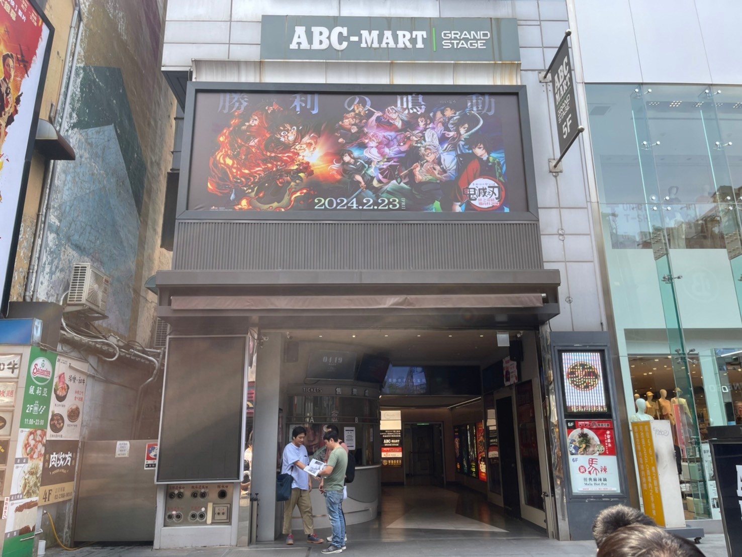 將戲院入口處為鏡頭中心,以仰角方式,由下往上拍攝,展現出廣告看板的活潑性
