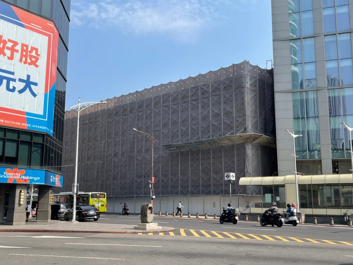 以正在拆除中的遠東百貨為主體,用兩旁新穎的高樓為陪襯,顯現出新舊交替的鮮明對比