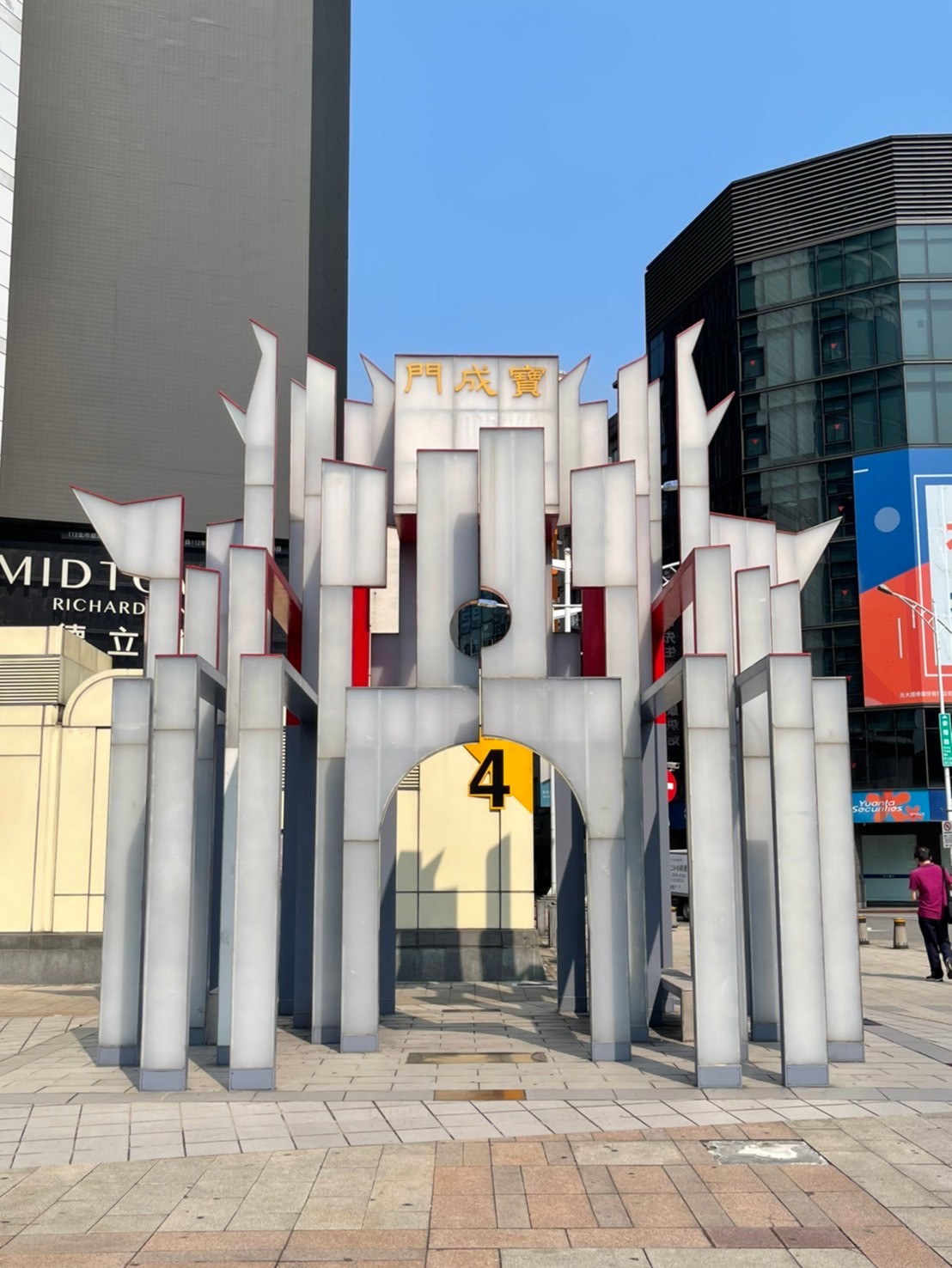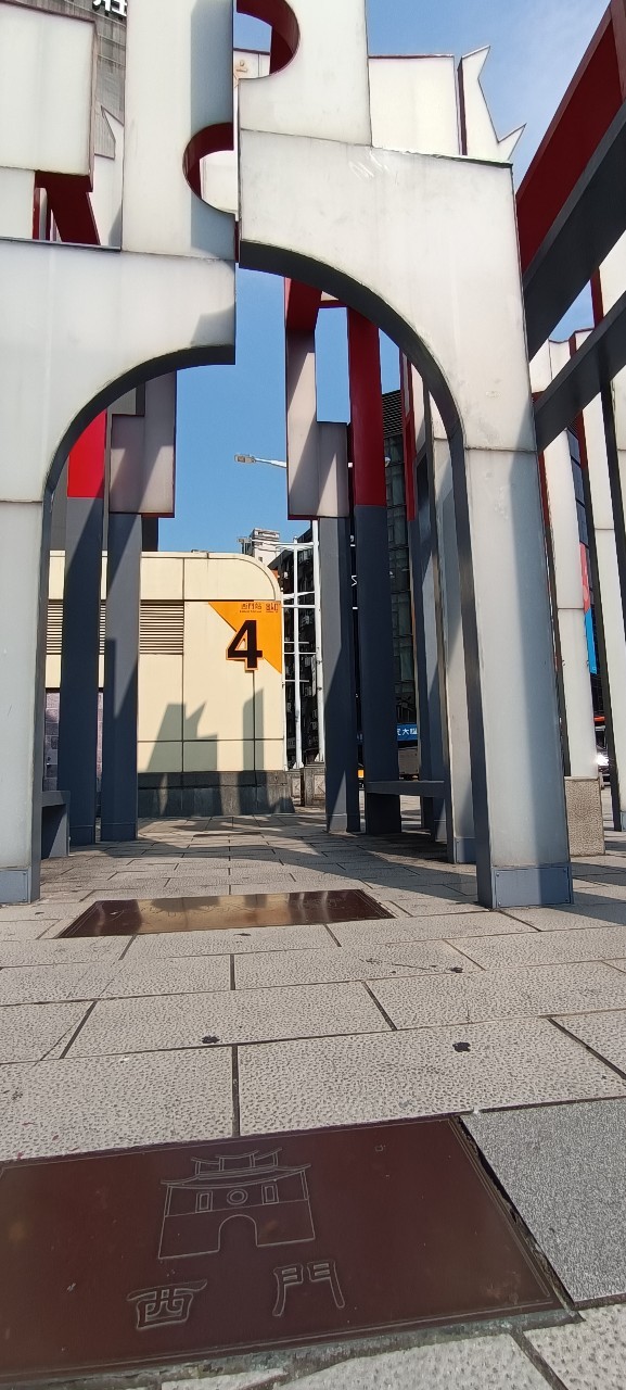 將鏡頭置於地面,把西門紀念碑與刻有西門象徵圖案的金屬板一起入鏡,藉由延伸的角度,兩者相互輝映