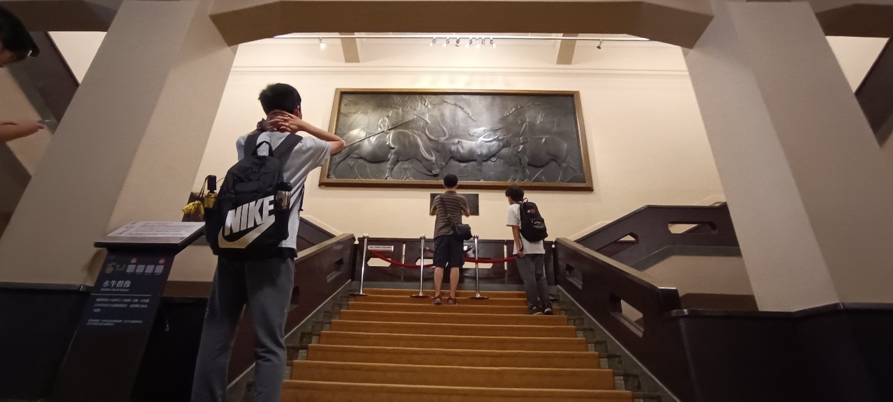 以階梯上的水牛群像為主體,人站在階梯下,由下往上的角度拍攝,高聳的階梯顯現出藝術品的珍貴